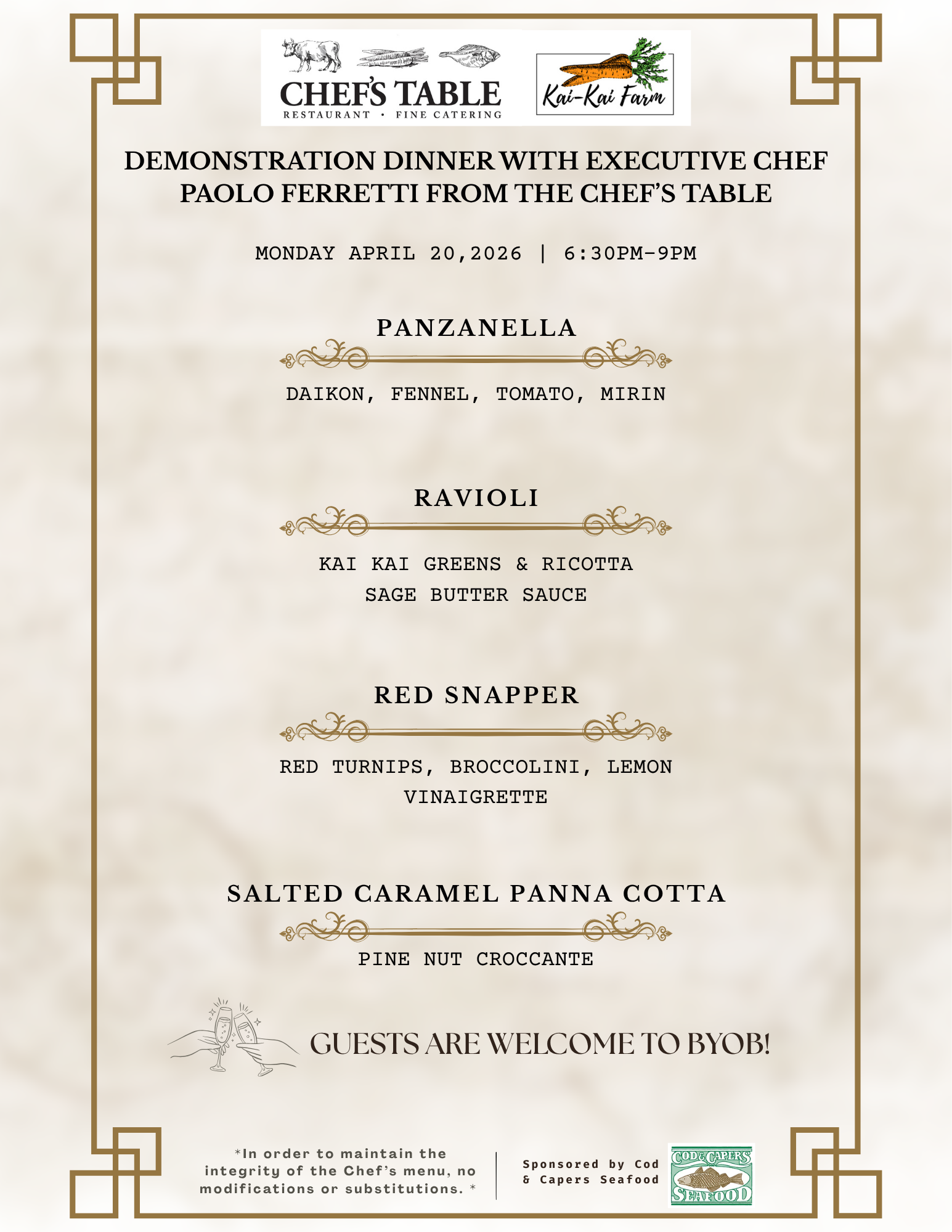 In order to maintain the integrity of the Chef’s menu, no modifications or substitutions will be made.